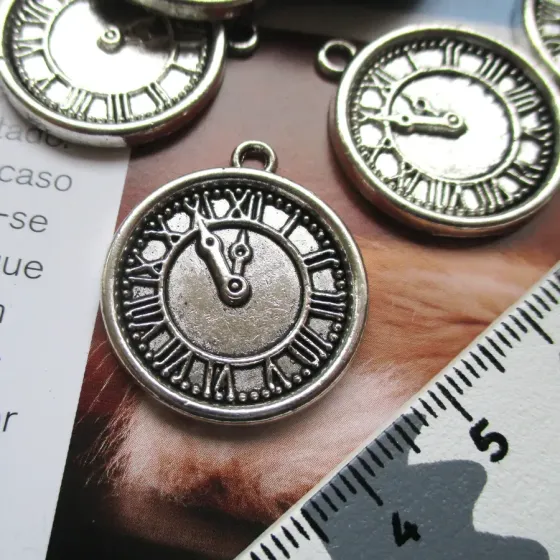 Pendente em forma de relógio. Foto representa frente e verso.