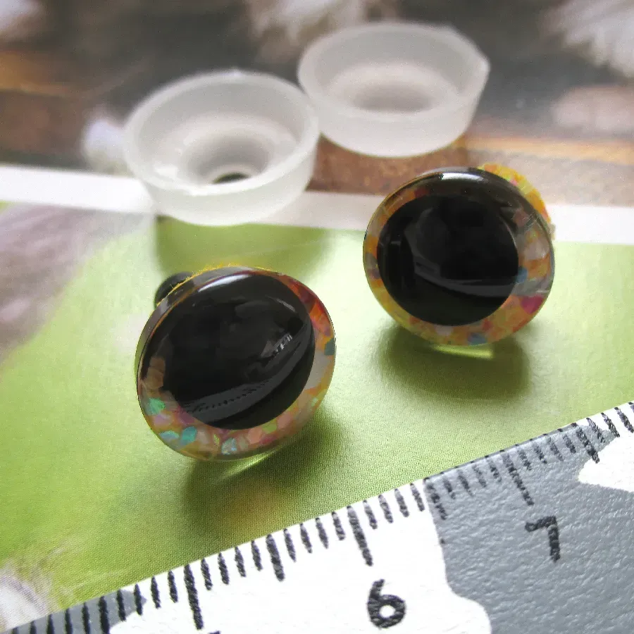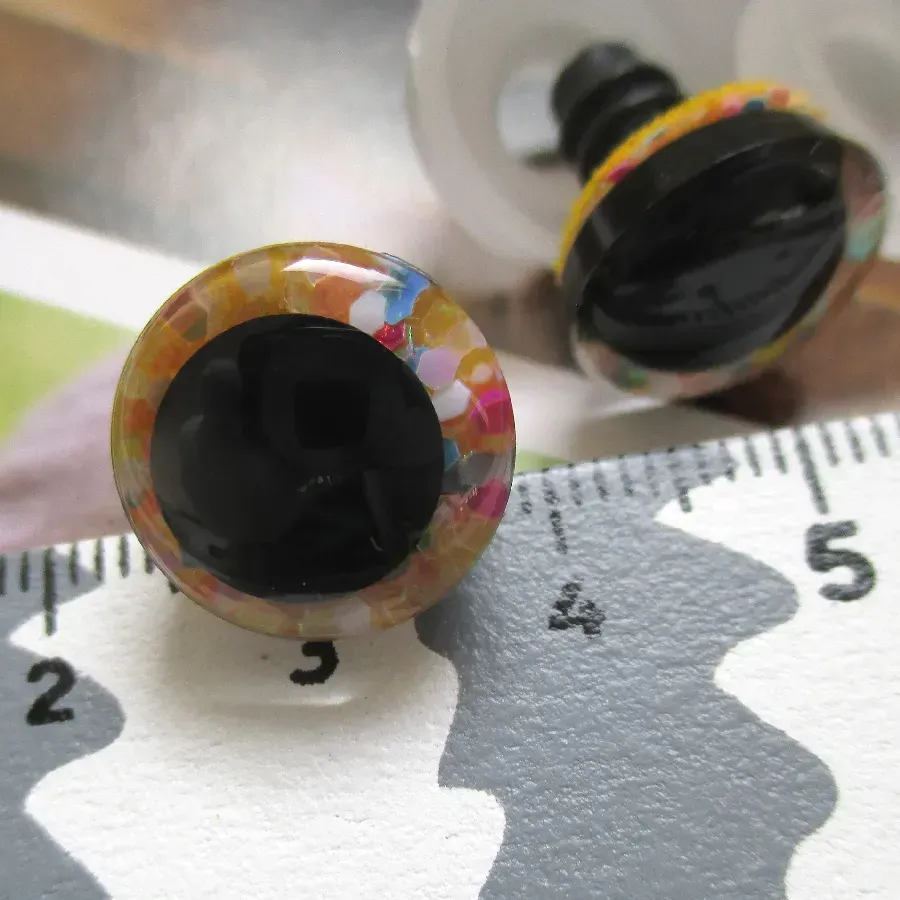 Par de olhos com purpurinas em fundo amarelo.