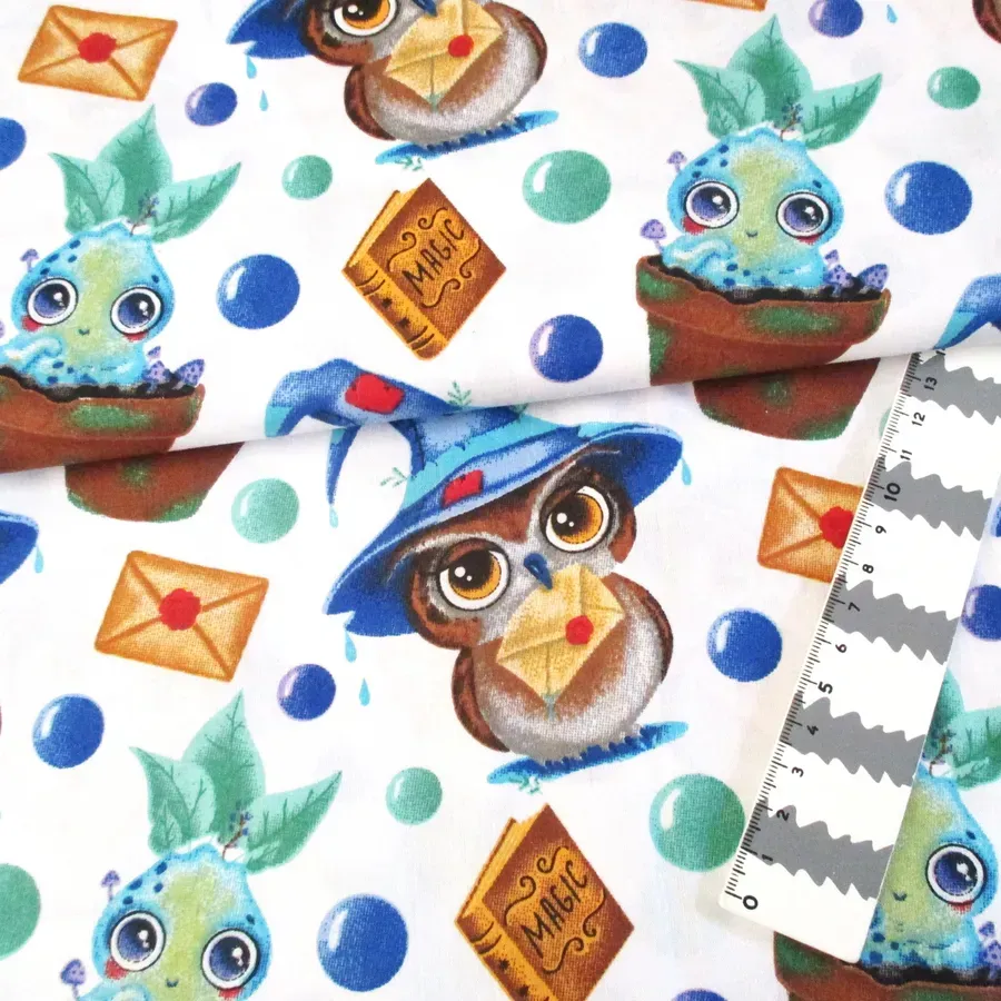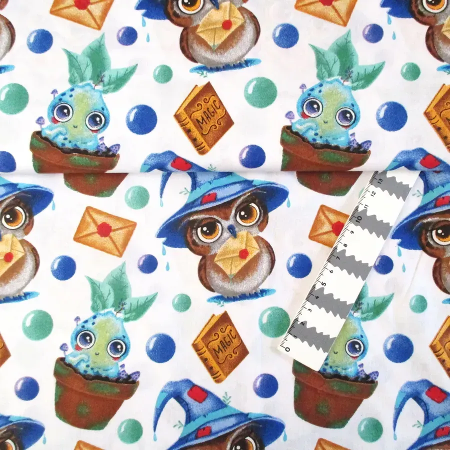 Tecido com desenhos de animais e tema magia.