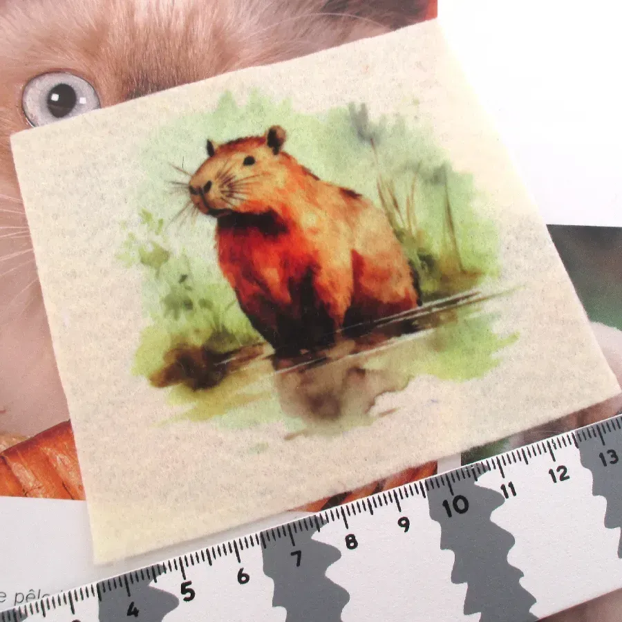 Aplicação em feltro com capivara estampada. Ideal para decorar trabalhos artesanais.