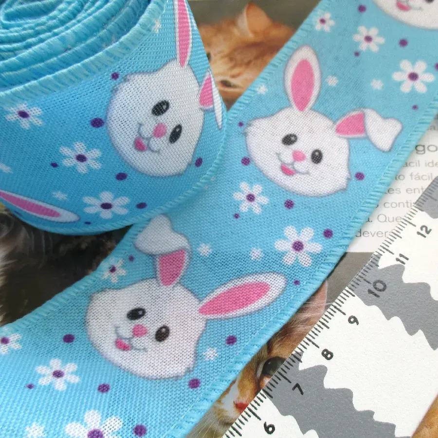Fita com arame nas laterais, com coelhos. Ideal para laços.