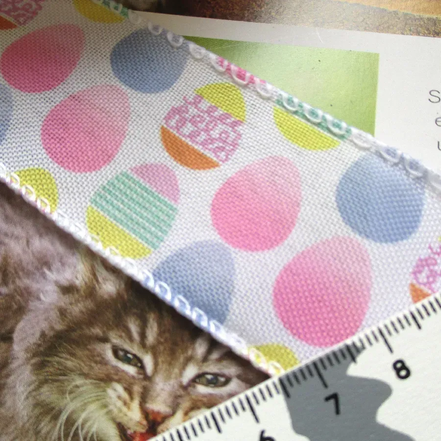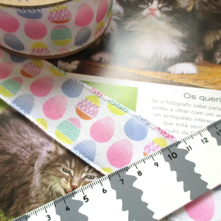 Fita com arame nas laterais, com ovos. Ideal para laços.