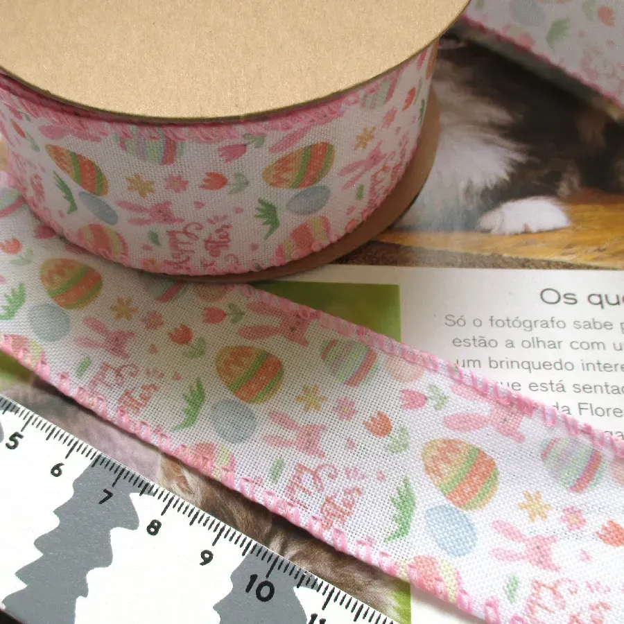 Fita com arame nas laterais, com motivos da Páscoa. Ideal para laços.