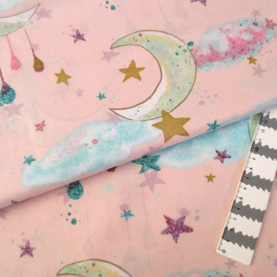 Tecido com desenhos de estrelas e lua.