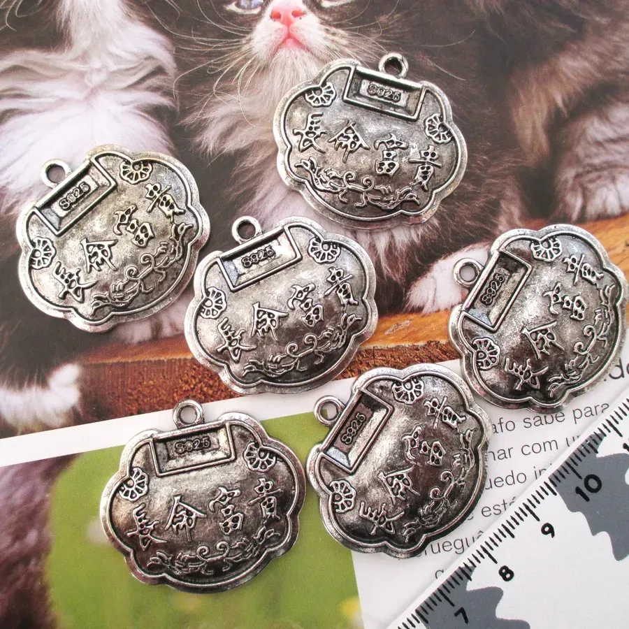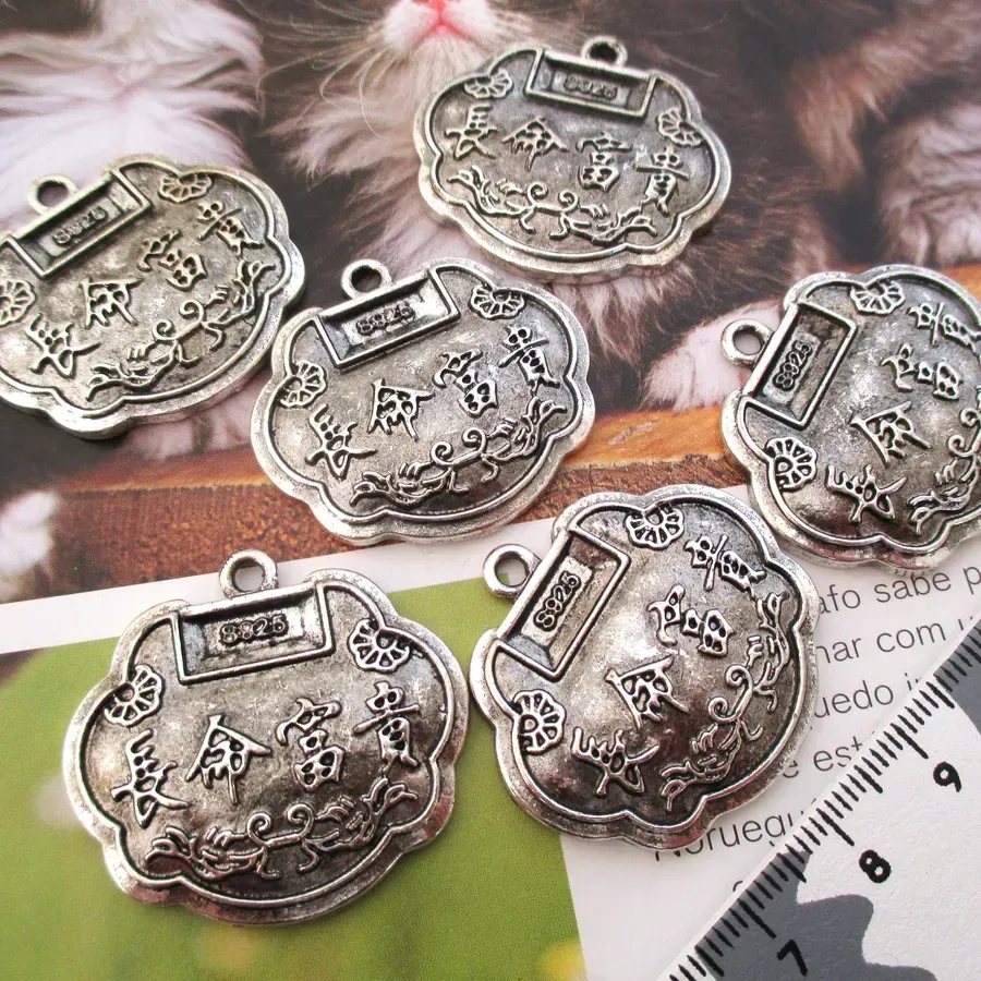Lote com 6 pendentes amuleto. A inscrição em caracteres chineses, significa "Longa vida, Riqueza e Honra".
