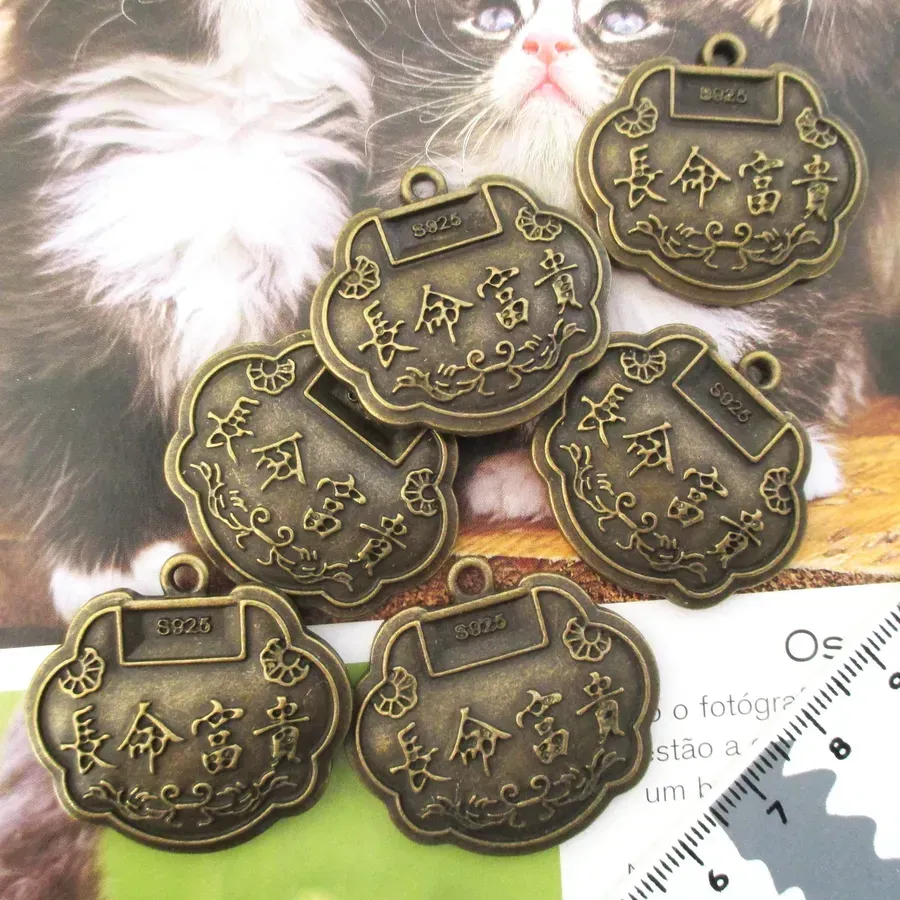 Lote com 6 pendentes amuleto. A inscrição em caracteres chineses, significa "Longa vida, Riqueza e Honra".