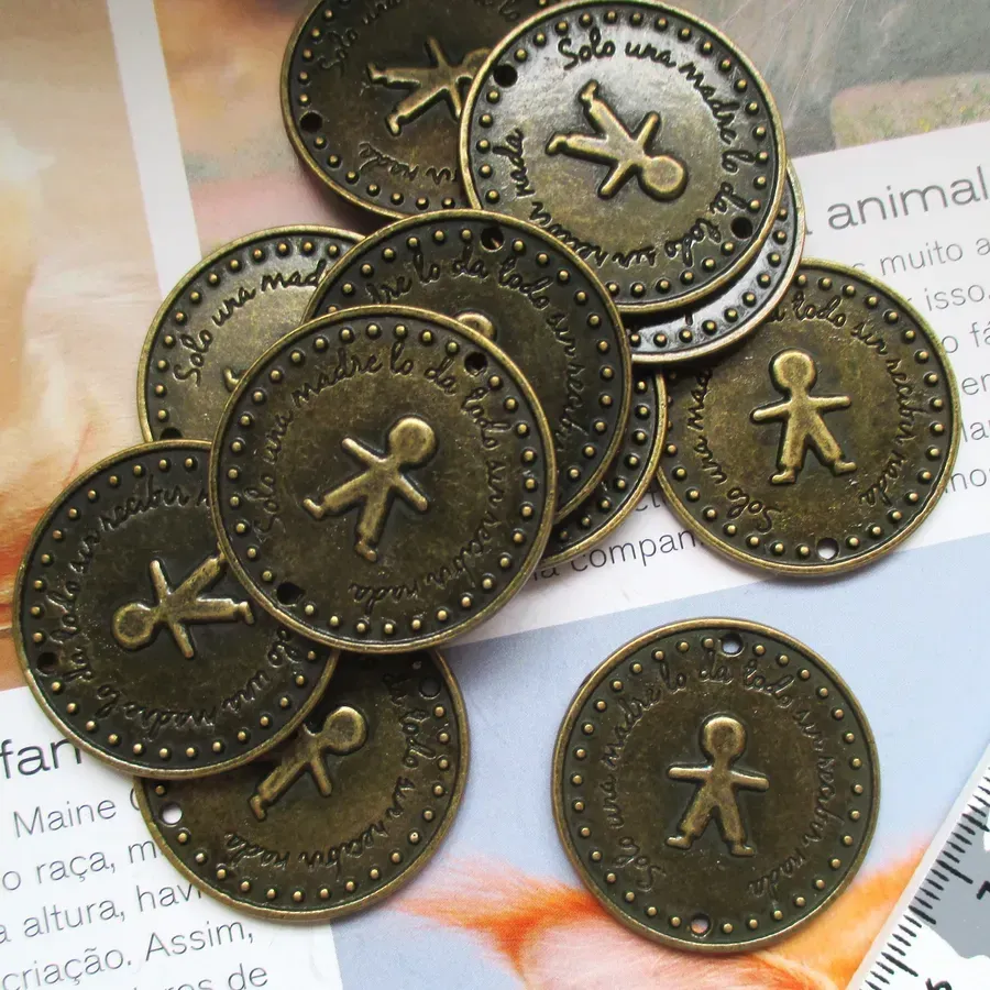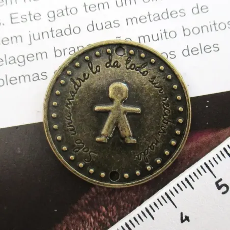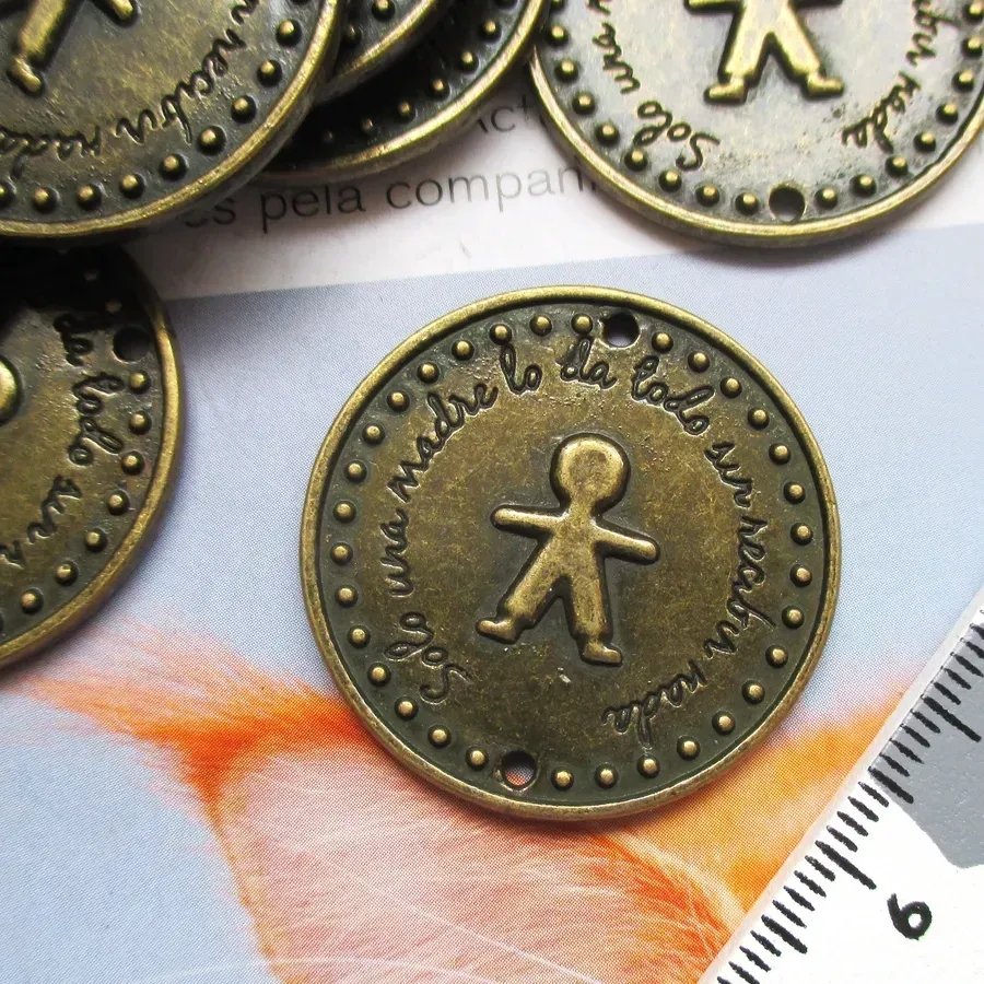 Lote 10 pendentes/conectores com desenho de menino.Cor: Ouro velho.Medidas: 32x32mm.