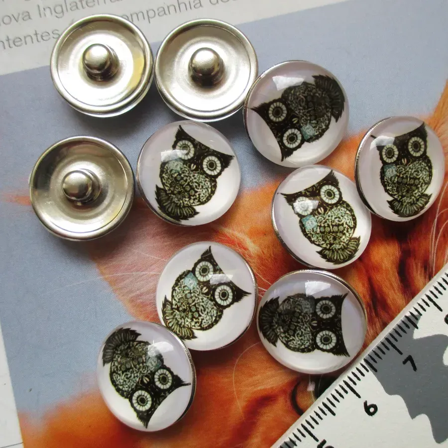 Lote com 10 cabochons / botões de pressão com desenhos de mochos. Para aplicar em pulseiras, pendentes, anéis, colares...